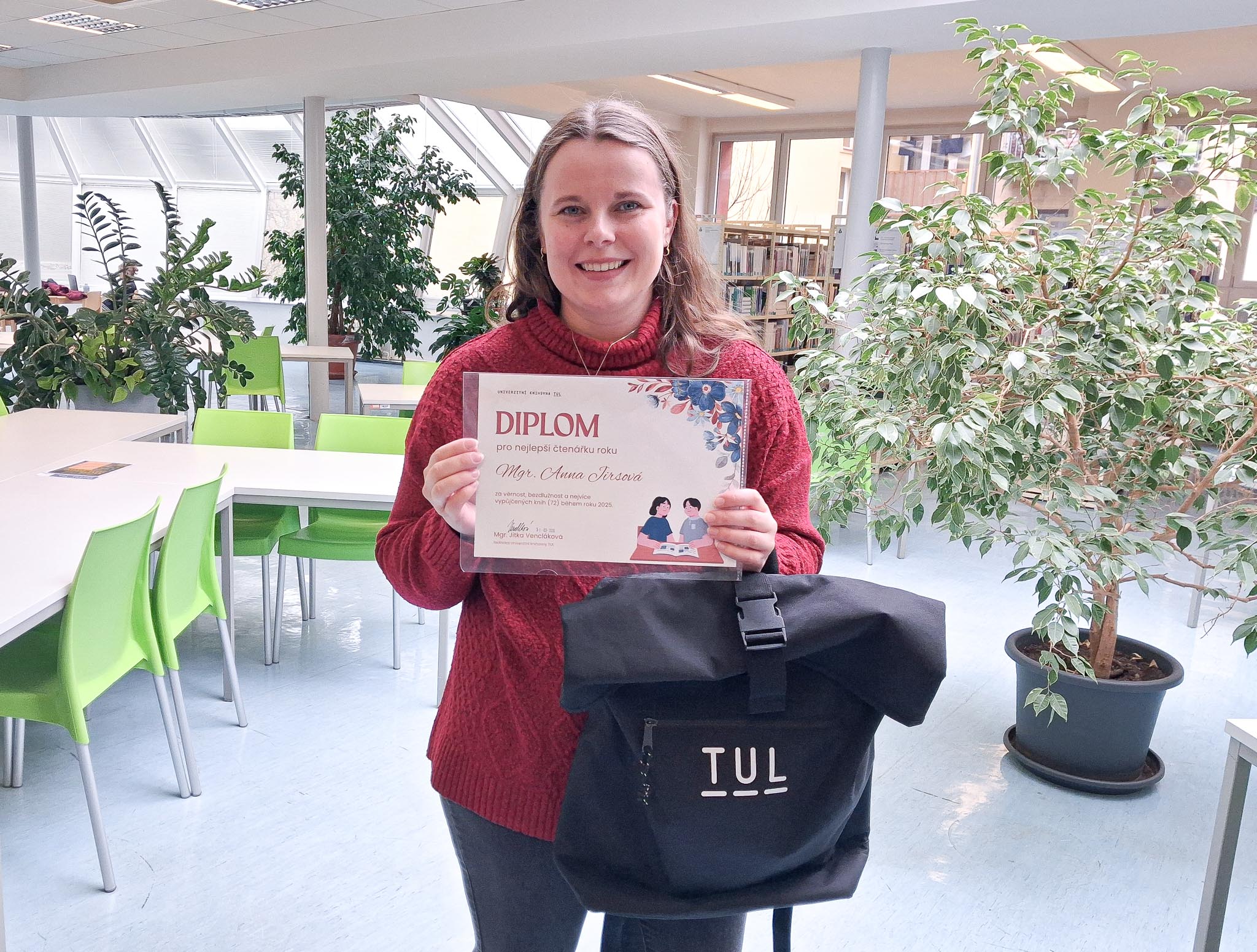 Podle statistiky si v průměru jeden uživatel Univerzitní knihovny půjčí za rok do šesti dokumentů. „Vítězství mě překvapilo, počet svých výpůjček nepovažuji za nic mimořádného,“ říká Anna Jirsová, když přebírá diplom a TULácký batoh plný univerzitních dárků od ředitelky knihovny Jitky Venclákové.