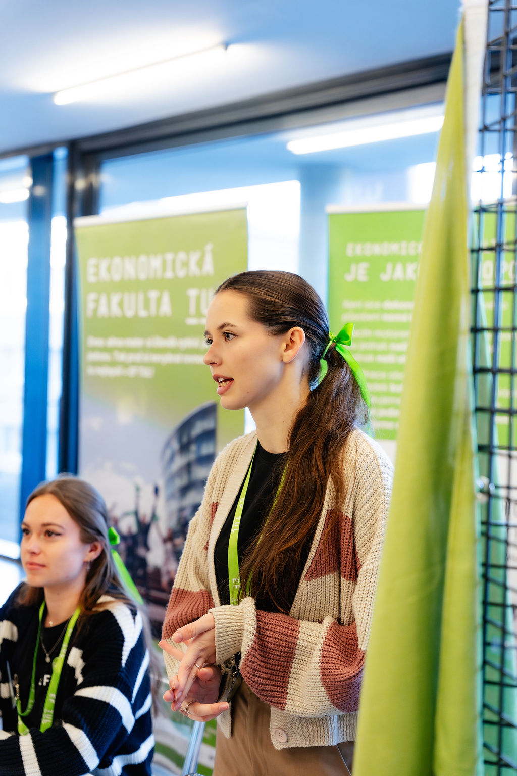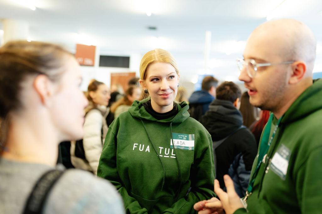 Na úvodní rozhovory v aule jsme navázali podrobnějším představením fakult ve vedlejší přednáškové místnosti. Také tady prezentace jednotlivých fakult dynamicky uváděl studentský moderátor – Kuba. Pokud i pak měl někdo na jazyku otázku a nechtěl se ptát v plné posluchárně, zjistil vše u stánků fakult v předsálí auly.