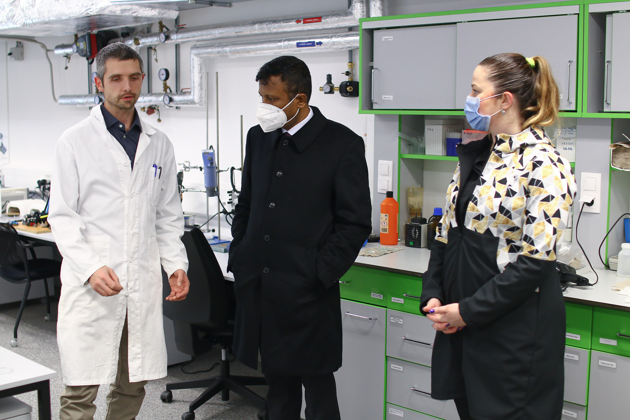 Kroky velvyslance vedly také do laboratoře Ústavu pro nanomateriály, pokročilé technologie a inovace CXI TUL. Velvyslanec si prohlédl výzkum přípravy nanovláken z přírodních obnovitelných materiálů.