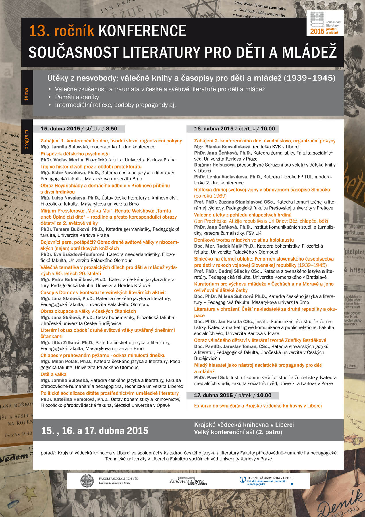 Katedra českého jazyka a literatury FP TUL ve spolupráci s Krajskou vědeckou knihovnou v Liberci a Fakultou sociálních věd UK v Praze pořádají ve dnech 15.–17. dubna konferenci s tématem "Útěky z nesvobody – válečné knihy a časopisy pro děti a mládež (1939–1945)".