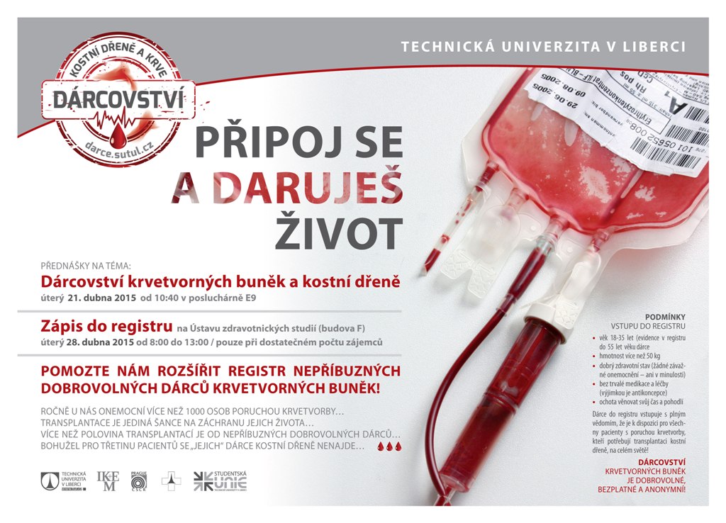 Studentská unie TUL letos vyhlásila třetí ročník kampaně na rozšíření Českého registru dárců krvetvorných buněk. Zápis do registru a odběry vzorků krve se budou v případě zájmu konat mezi 8.00 a 14.00 hodinou na ústavu zdravotnických studií.