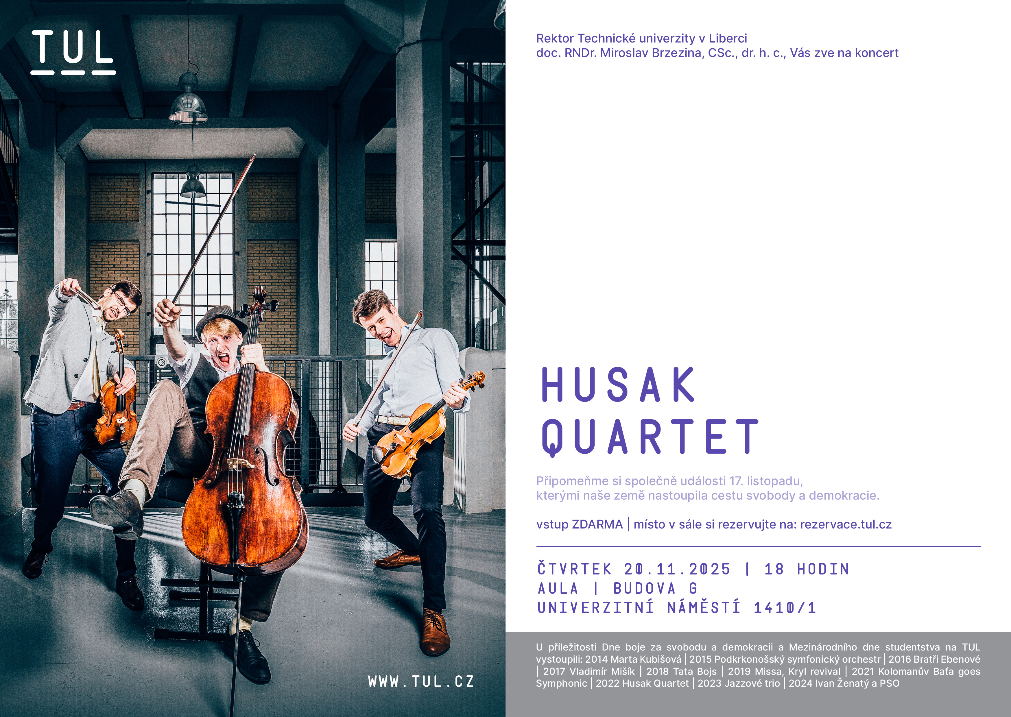 Rektor Technické univerzity v Liberci Miroslav Brzezina zve studenty i zaměstnance TUL na koncert k připomínce Dne boje za svobodu a demokracii a Mezinárodního dne studentstva. U příležitosti událostí 17. listopadu na TUL vystoupí na Husak Quartet.