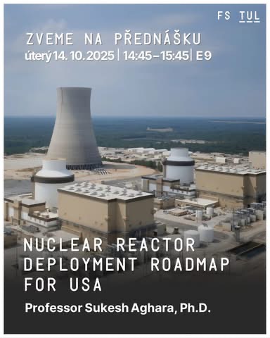Katedra energetických zařízení Fakulty strojní TUL zve na odbornou přednášku profesora Sukeshe Aghary, Ph.D. z Massachusettské univerzity Lowell na téma „Nuclear reactor deployment roadmap for USA“. Přednáška se zaměří na současné trendy a plán rozvoje jaderných reaktorů ve Spojených státech, včetně technologických, regulačních a ekonomických aspektů.