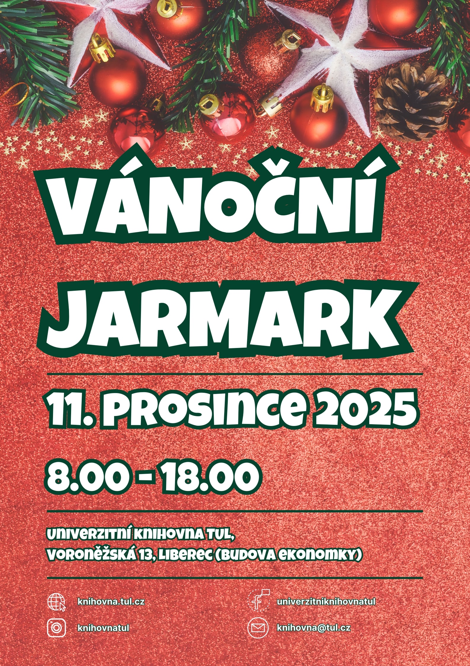 Univerzitní knihovna TUL zve všechny své čtenáře (i nečtenáře) na tradiční Vánoční jarmark. Nasajete vánoční atmosféru a třeba i pořídíte něco milého sobě nebo svým blízkým. Hezkých výrobků bude na jarmarku řada – od vánočních dekorací, pleteného a háčkovaného zboží přes šperky až po ozdoby. A těšit se můžete i na punč a vánoční cukroví.