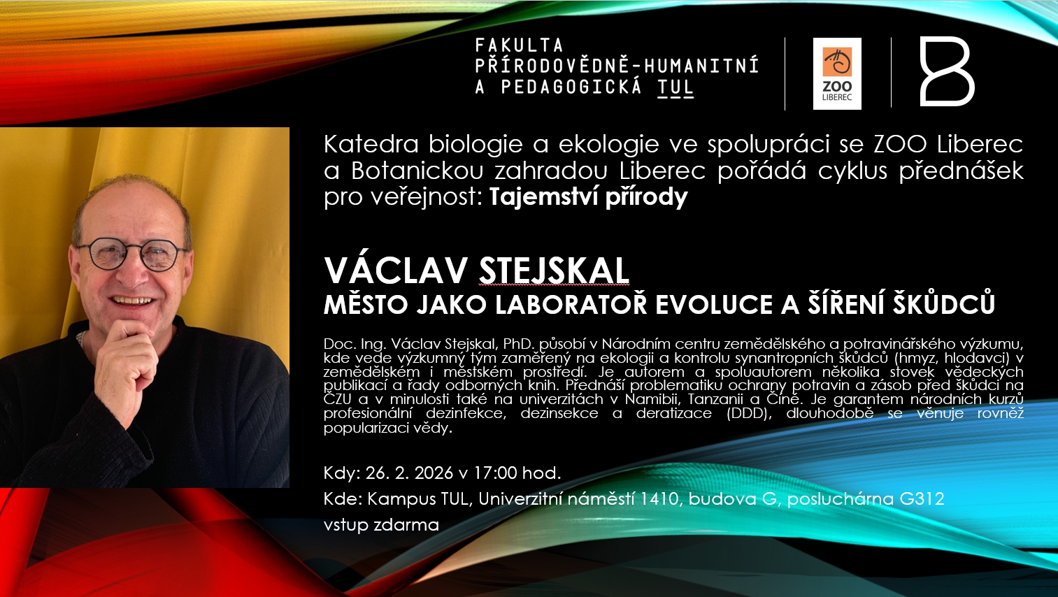 Docent Stejskal vystoupí na TUL v rámci cyklu přednášek pro veřejnost: Tajemství přírody. Cyklus pořádá Katedra biologie a ekologie FP TUL ve spolupráci se ZOO Liberec a Botanickou zahradou Liberec.