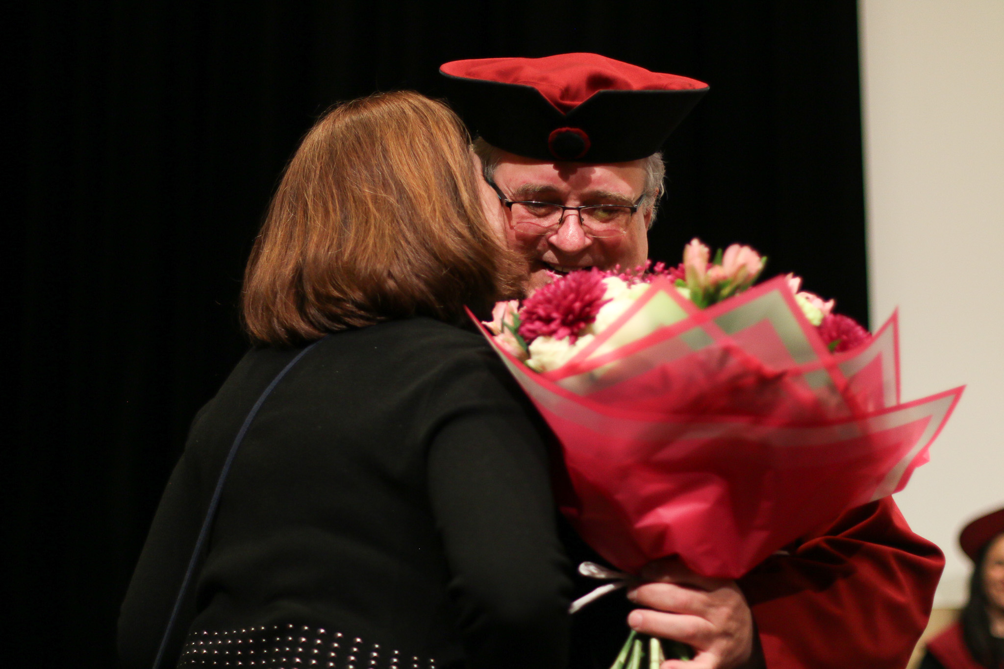 „Technické univerzitě chci popřát úspěch. A novému vedení v čele s rektorem Kocourkem, ať vás v životě buď nikdy nepotká porážka, nebo kdyby, tak aby byla tak slabá, že ji dokážete překonat a pokračovat ve své práci dál,“ popřál docent Brzezina. Poděkoval také všem spolupracovníkům a vyzdvihl podporu své rodiny. Na pódium pozval svoji ženu Danielu.