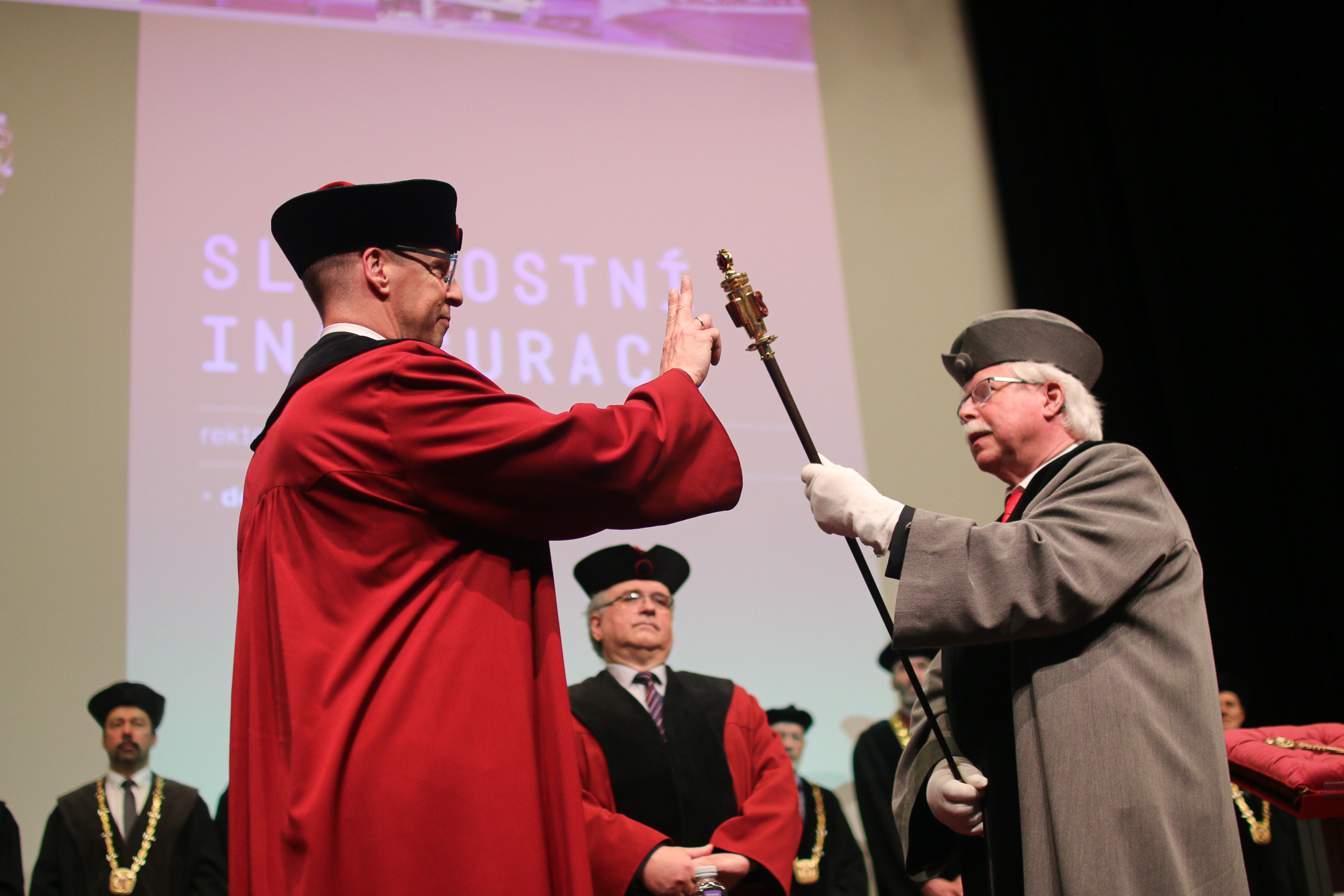 Následně rektor složil slib akademické obci a převzal řetěz jako symbol akademického úřadu a s tím spojených pravomocí. Emeritní rektor Brzezina pak předal svému nástupci Aleši Kocourkovi symbolický klíč od univerzity.