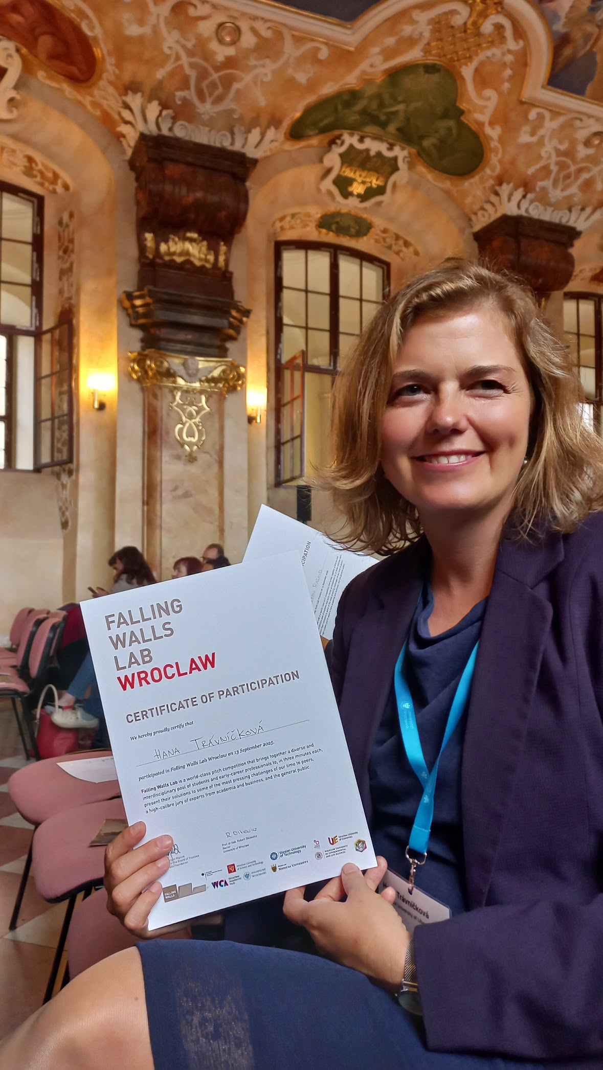 Letos se finále Falling Walls zúčastnila také doktorandka TUL Hana Trávníčková z Ekonomické fakulty TUL. Do pražského finále byla pozvána již loni, ale kvůli úrazu se nemohla zúčastnit; letos se dostala mezi finalisty ve Wroclavi (Vratislavi). V mezinárodní konkurenci vědců upozornila na problém neustálého nárůstu informací na pracovišti a s tím spojeného stresu. Řešení vidí v každodenním krátkém a soustředěném učení, například pomocí nástroje GrowZ.one, který získal i první cenu poroty v soutěži Start-up TUL 2024. „Díky finále Falling Walls jsem měla možnost prezentovat svůj nápad mezi vědci z celého světa – od medicíny po astrofyziku. Děkuji za podporu své školitelce docentce Maršíkové a Markétě Hujerové, dříve Klíčové, finalistce celosvětového finále z roku 2018. Těší mě, že soutěž potvrdila potenciál řešení GrowZ.one,“ říká Hana Trávníčková.
